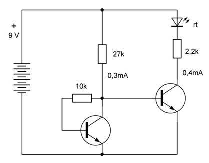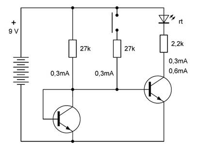 Der rechte Transistor bekommt dieselbe Basisspannung. Unter der Voraussetzung, dass er genau gleiche Daten hat, fließt dann auch durch ihn ein gleich großer Strom. Die LED wird also mit dem Strom von 0,3 mA betrieben. Man sieht eine geringe Helligkeit. Wenn man den zweiten 27-kΩ-Widerstand dazuschaltet, verdoppelt sich der LED-Strom auf 0,6 mA.