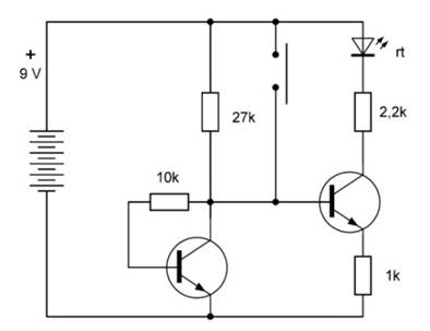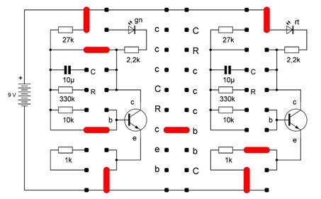 In diesem Fall wird der Strom durch die grüne LED überwacht und mit der roten LED angezeigt. Weil die Kontroll-LED weniger hell sein soll als die überwachte LED, wird die Emitter-Gegenkopplung eingesetzt. Sobald man den Strom durch die grüne LED unterbricht, geht auch die rote LED aus.
