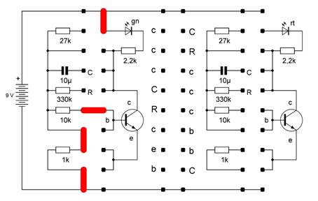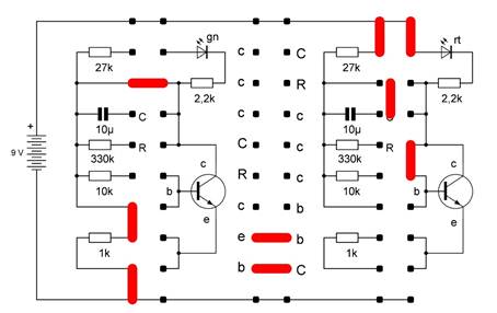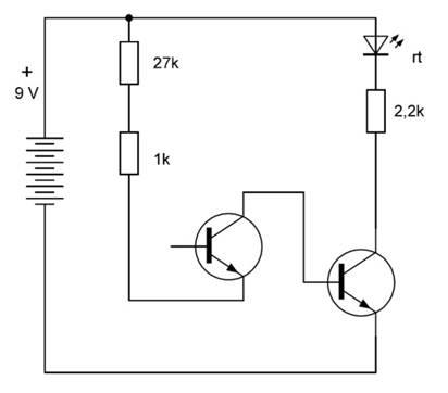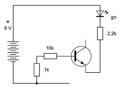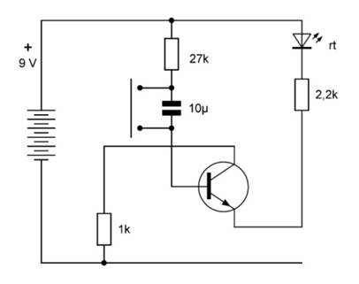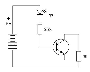 roten LED. Wenn man den Basisstrom über den 27-kΩ-Widerstand einschaltet,