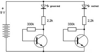 respectively, and assuming constant voltages with values Vbe = 0.6 V, Vgreenled