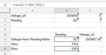 A linear relationship was used: Voltage in microvolts = 3164 * ADC_reading - 3161.