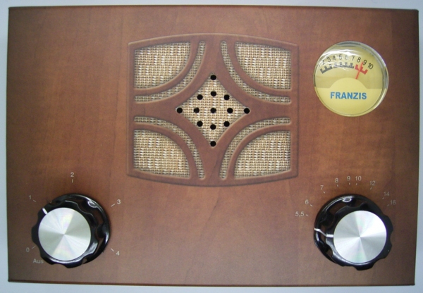 Das Radio wurde in das Gehäuse des Retroradios von Conrad/Franzis eingebaut. Das relativ große Gehäuse sorgt für einen angenehmen Klang. Die großen Knöpfe helfen zusätzlich bei der einfachen Bedienung. Das ohnehin vorhandene Messinstrument wird zur Anzeige der Batteriespannung eingesetzt.