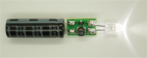 LED-Spannungswandler, der der Elektor 9/2007 kostenlos beilag. Der Speicher-Kondensator hat 10 F, 2,3 V.