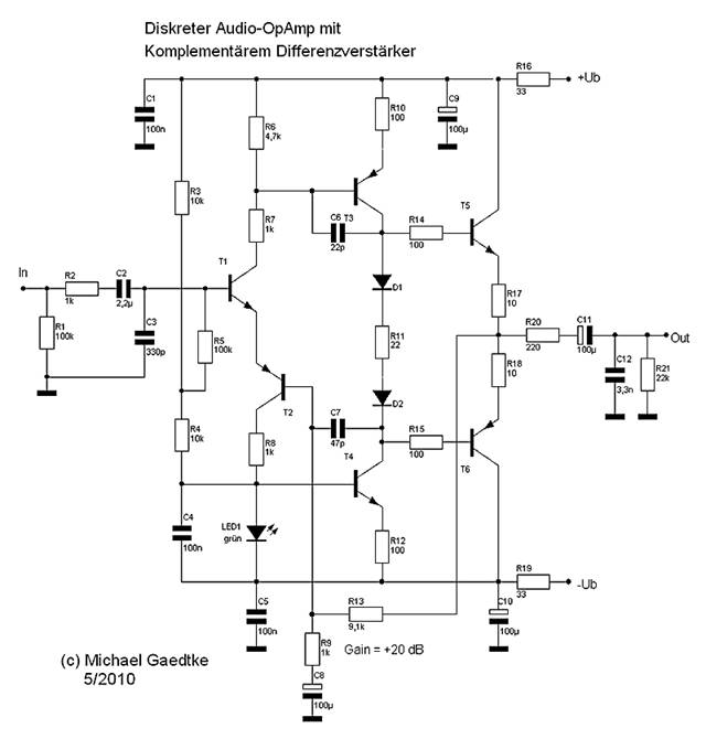 Vorverstärker mit diskretem OpAmp und komplementärer Differenz-Eingangsstufe