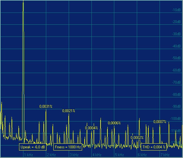 Was kann man von der einfachen Schaltung erwarten? Sicherlich nicht die Verzerrungsarmut, die mit den neuesten Super-OpAmps erreicht werden kann. Aber die Ergebnisse können sich – wie das oben abgebildete Spektrogramm zeigt - durchaus sehen lassen. Die THD-Gesamtverzerrungen liegen mit 0,004 Prozent nur unwesentlich über den Klirrprodukten des Testgenerators (gemessen wurde mit einer 24-Bit-Soundkarte bei einer Samplerate von 48.000 Hz). Das Signal war auf -6 dB(FS) unter Vollaussteuerung der Karte (ca. 1 Volt) und 1000 Hz eingestellt. Dabei überwiegt mit 0,0031 Prozent der „gutmütige“ Klirr 2. Ordnung; der disharmonische Klirr 3. Ordnung erreicht nur 0,0021 Prozent, alle höheren Klirrprodukte sind noch geringer. Das kann sich sehen lassen!