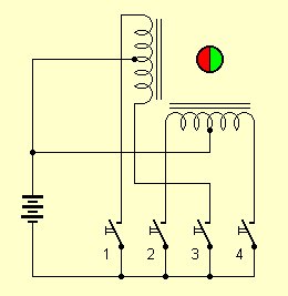 Der Schrittmotor enthält zwei Spulen und einen drehbar gelagerten Magneten. Oft hat jede Spule noch eine Mittenanzapfung. Dann kann man den Schrittmotor mit vier Tastschaltern betreiben. Drückt man die in der richtigen Reihenfolge, dann dreht sich der Anker in kleinen Schritten weiter.