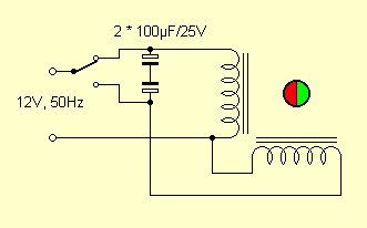 Aber es geht auch anders. Der Aufbau erinnert etwas an den eines Synchronmotors mit vier statt drei Phasen. Also muss er auch mit Wechselstrom zum Drehen zu bewegen sein. Man braucht nur noch einen Kondensator zur Phasenverschiebung. Die Wahl des Kondensators richtet sich etwas nach dem Widerstand der Spulen. Der kapazitive Widerstand bei 50 Hz soll etwa gleich dem Spulenwiderstand sein. Bei 75 Ohm macht das ca. 42 Mikrofarad. Es kommt aber nicht so genau darauf an. Wenn man Elkos einsetzen möchte, sollten zwei doppelt so große gegeneinander geschaltet werden, und man sollte solche mit einer hohen Spannungsfestigkeit wählen.