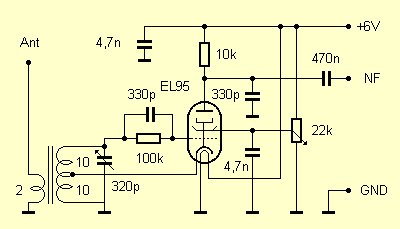 Ich hab´s wollen wissen: Bekommt man ein Röhren-Kurzwellenaudion so stabil, dass es sogar für DRM taugt? Und das ganze sollte mit 6 V auskommen, damit nur eine Spannung für Heizung an Anode nötig ist. Da bietet sich die EL95 an, zwar eigentlich keine HF-Röhre sondern eine Endpentode, aber mit ordentlicher Steilheit auch bei kleiner Anodenspannung. Außerdem braucht sie nur sparsame 200 mA für die Heizung. Alles kann mit einem kleinen Akku betrieben werden, so dass es keine Probleme mit 50-Hz-Brummen gibt.