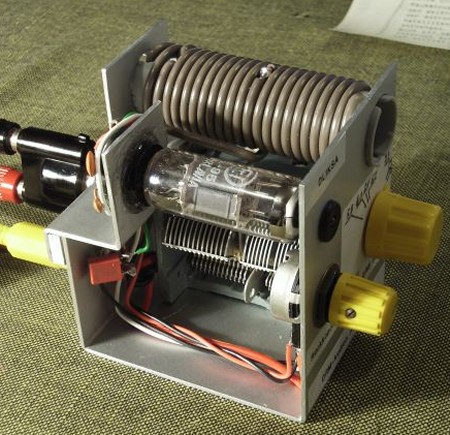 Die Stabilität steht und fällt mit dem Schwingkreis. Also wurde eine kräftige Spule mit 20 Windungen aus 1,5 mm dickem Draht auf ein PVC-Rohr mit 18 mm Durchmesser gewickelt. Mit kurzen Verbindungen zum Luftdrehko erhält man eine hohe Leerlaufgüte weit über 300. Auch alle anderen Verbindungen sind sehr stabil ausgelegt. Nichts darf wackeln oder mechanisch schwingen. Sogar die Röhre wurde an ihrem Glasstutzen schwingungsdämpfend abgestützt.
