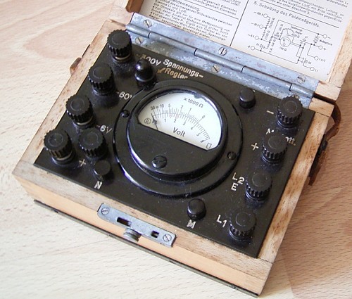 Die Bezeichnung "Feldmessgerät" war Ausgangspunkt für eine Suche im Internet. In Jogis Röhrenbude gab es die gesuchten Informationen. Es handelt sich um ein Messgerät der deutschen Wehrmacht und ist damit über 60 Jahre alt. Ich habe die Spannungsbereiche überprüft: Es ist alles noch so genau wie am Anfang.