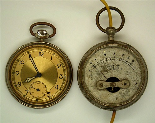 Es ist traurig, dass die besten Sachen immer für das Militär gebaut werden. Aber das folgende Gerät ist völlig zivil: Ein 6-Volt-Taschenmessgerät im Gehäuse einer Taschenuhr. Es wurde bei Aufräumarbeiten in der alten Werkbank gefunden und hat vielleicht mal als mobiles Testgerät für die Motorrad-Elektrik gedient. Es handelt sich übrigens um ein Dreheisen-Messwerk, denn wenn man eine angeschlossene Batterie umdreht, bleibt der Zeigerausschlag gleich. Damit kann man also auch Wechselspannungen messen. Leider ist das Messgerät nicht mehr sehr genau: Eine alte 4,5-V-Flachbatterie hat angeblich volle 6 Volt. Wahrscheinlich wurde das Gerät in den schweren Zeiten der Inflation gebaut. Und anscheinend waren die späteren Zeiten auch nicht viel besser, denn das Messgerät hat leider kein Glas mehr und sieht auch sonst sehr mitgenommen aus.