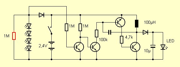 Hier die Schaltung: Rechts erkennt man einen Oszillator mit Drossel ähnlich wie beim LED-Spannungswandler. Leider ist die Kapazität des SMD-Rückkopplungskondensators nicht erkennbar. Links im Schaltbild sieht man die Abschaltautomatik: Wenn die Spannung an der Solarzelle noch zu hoch ist, wird der Oszillator gesperrt. Dabei braucht die Schaltung dann nur noch ein Strom von unter 5 µA. Allerdings war die Schottky-Ladediode in Sperrrichtung nicht dicht genug. Auch im Dunkeln lag noch über 1 V an der Fotozelle und der Oszillator damit abgeschaltet.