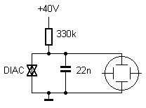 Die beiden Hochspannungs-Transistoren bilden offensichtlich einen selbstschwingenden Gegentaktoszillator. Zusammen mit der Spule L und einem Hochspannungskondensator wird ein Resonanzkreis aufgebaut. Es handelt sich also um eine Art Tesla-Generator. Aber wie schwingt der Oszillator an? Dazu dient der DIAC, den man sonst nur aus Dimmern kennt. Vor dem Start des Oszillators lädt sich der zugehörige 22-nF-Kondensaotr so weit positiv auf, bis der DIAC zündet und den Oszillator startet. Wenn alles korrekt schwingt, sorgt D1 dafür, dass der Startkondensator auf etwa 0 V entladen bleibt und der DIAC nicht wieder in Aktion tritt. Wie der DIAC arbeitet, zeigt die folgende Schaltung eines kleinen Sägezahngenerators. Immer wenn der Kondensator bis auf ca. 35 V aufgeladen wurde, zündet der DIAC und entlädt ihn bis auf ca. 15 V. Am Oszilloskop können die Schwingungen angesehen werden.