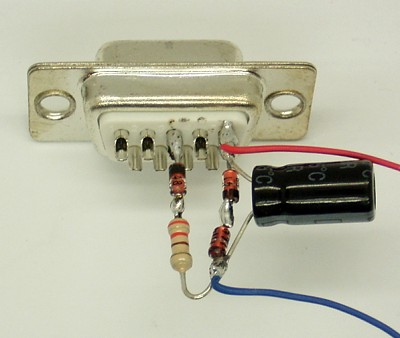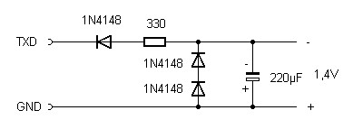 Also gut, die Batterie der Uhr wird entfernt. Statt dessen werden zwei Drähte an gelötet. Der blaue Draht liegt am Minuspol, der rote am Pluspol. Die serielle Schnittselle liefert an der Datenleitung TXD am Pin 3 des 9-poligen Steckers im Ruhezustand -10V. DerMasseanschluss GND liegt am Pin 5. Jetzt muss man nur noch dafür sorgen, dass die Uhr die gewohnte Spannung von ca. 1,5 V bekommt. Drei Si-Dioden, ein Widerstand und ein Elko reichen aus, um die Betriebsspannung auf etwa 1,4 V zu stabilisieren. Die Durchlassspannung einer Si-Diode liegt nämlich bei ca.0,7 V.