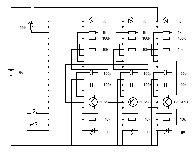 ähnliche Schaltung habe ich schon mal für das Conrad-Osterei verwendet oder auch im analogen Lauflicht mit neun LEDs. Hier kann man zwischen zwei Geschwindigkeiten wählen, indem man je nach Wunsch 100 k oder 10 k anschließt.