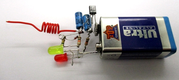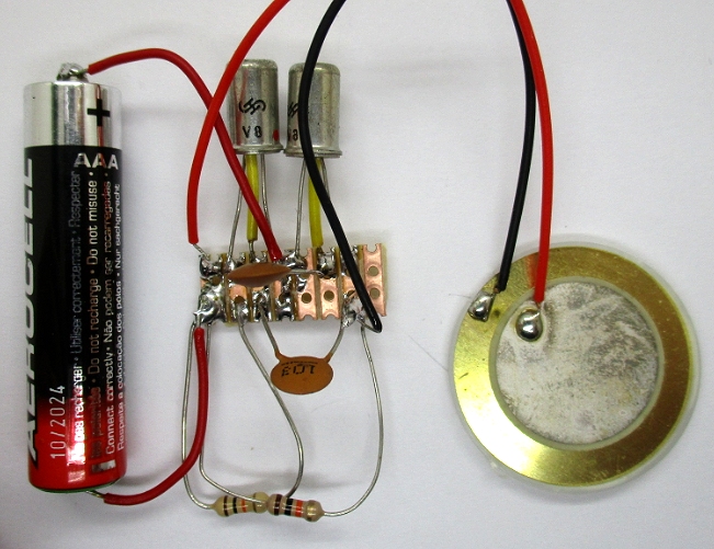 einfache Schaltung habe ich freitragend auf eine alte Batterie gelötet,