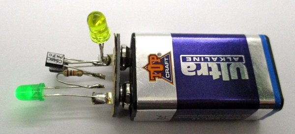 Die Bauteile wurden direkt auf einen Batterieclip gelötet, der aus