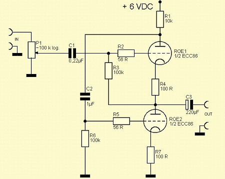 Ich habe mal wieder in Ihrem Archiv gestöbert und, nachdem ich jetzt endlich im Besitz einer ECC86 bin, den Tipp Nr. 17 ausprobiert. Als NF-Quelle habe ich den line-out von einem CD-Walkman benutzt. Als Arbeitswiderstand der 2. Röhrenstufe habe ich einen ausgebauten Netztrafo verwendet. An dessen Sekundärseite dann mein dynamischer Kopfhörer. Der Klang kann als sehr zufriedenstellend bezeichnet werden, auch ohne extra gewickelten Ausgangsübertrager.