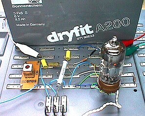 Wenn man mit der ECC86 einen Verstärker und einen Tongenerator bauen kann, ist es auch nicht mehr weit bis zum Radio. Auf der Basis einen Kosmos-Baukastens wurde ein fast klassisches Röhren-Audion für den Mittelwellen-Bereich gebaut. Zur Stromversorgung dient ein Blei-Gel-Akku mit 6 V.