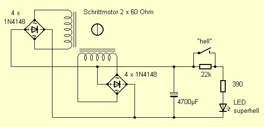 Eine Zusatzschaltung sorgt für eine Energiespeicherung. Zwei Vierweggleichrichter mit je 4 Dioden 1N4148 laden einen Elko mit ca. 4700 µF auf (Im Beispiel wurde 2 * 2200µF parallel verwendet). Die super-helle LED wird umschaltbar über einen Vorwiderstand von 390 Ohm (sehr hell) oder 22 K (lange Speicherzeit) betrieben. Der Anwender muss sich beim Drehen etwas beherrschen: In Schalterstellung "hell" kann der zulässige Maximalstrom von 20 mA überschritten werden, in Stellung "lang" überschreitet man leicht die zulässige Spannung der Elkos von z.B. 16 V.