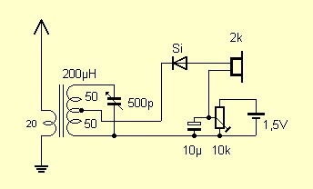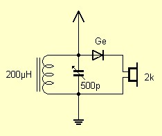 Die gewünschte Selektion erreicht man durch einen Schwingkreis aus Spule und Drehkondensator. Mit einem Drehkondensator von 500 pF und einer Spule mit 200 µH überstreicht man den ganzen Mittelwellenbereich. Die Spule kann als Luftspule mit 100 Windungen auf eine Papprolle mit einem Durchmesser von 4 cm aufgewickelt werden. In dieser Schaltung funktioniert übrigens auch ein Kristall-Ohrhörer sehr gut. Bei den Schaltungen ohne Spule geht er nicht.