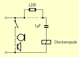 Der Fotowiderstand ist in Reihe mit der Klingelspule angeschlossen und lässt den Strom nur bei Helligkeit hindurch. Üblich ist übrigens eine relativ hohe Welchselspannung von ca. 100 V bei einer Frequenz von 25 Hz. Das stammt noch aus den Zeiten des Kurbelinduktors, gilt aber noch heute für jedes analoge Telefon. Der Fotowiderstand schaut einfach an einem kurzen Kabel hinten raus. Es klappt auch ohne direkte Bestrahlung, indirektes Licht reicht. Der Unterschied von 100 Ohm (hell) und 1 Megohm (dunkel) ist bei einem LDR so groß, dass es praktisch so gut funktioniert wie mit einem Schalter.