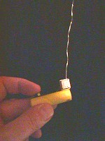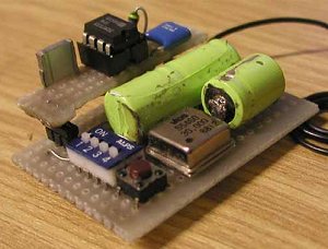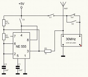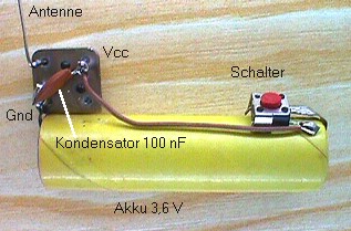 Wenn schon Prüfsender, dann bitte quarzgenau! Beim Schlachten eines defekten CD-Laufwerks fiel mir ein gekapselter CMOS-Quarzoszillator für 48 MHz in die Hände. Das Bauteil ist für 5 V Betriebsspannung ausgelegt, läuft aber auch noch bei 3,6 V. Ein Akku, Kondensator, Schalter, Antenne, fertig.