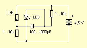 Die Schaltung ist nicht schwer zu verstehen. Immer wenn Licht auf den LDR fällt, steigt der Strom. Der Kondensator lädt sich auf und vergrößert den Basisstrom. Damit schaltet der Transistor die LED ganz ein. Der stabile AN-Zustand kippt in den AUS-Zustand, sobald der Kondensator völlig geladen ist. Die LED ist dann aus, die Basisspannung wird negativ, und der Transistor sperrt. Erst wenn der Kondensar durch den Basiswiderstand vollständig umgeladen ist, kann die Schaltung erneut in den AN-Zustand kippen.