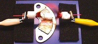 Als Lager dienen Leistungstransistoren, Spannungsregler oder Ähnliches. Der mittlere Anschluss ist meist mit dem Gehäuse verbunden und kann mit Krokodilklemmen an die Stromquelle gelegt werden. Im Versuch standen die Lager auf Moosgummi, Styropor geht auch. Wichtig ist, dass die Lager aus Metall sind, um den Strom zur Achse zu leiten. Und sie sollen größer sein als die Achse, damit sich alles schön locker drehen kann.