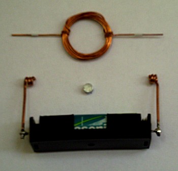 Es wurde ein kleiner, starker Magnet verwendet, der direkt auf der Batterie liegt. Die Achslager bestehen aus Kupferdraht.