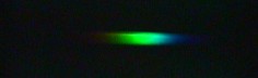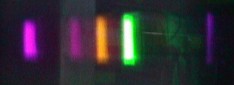 Ganz anders sieht das Licht einer Bräunungslampe aus. Hier hat man ein Linienspektrum. Was hier nicht ganz farbecht wiedergegeben wird, sind die Linien des Quecksilbers, denn die UV-Lampe ist eine Quecksilberdampflampe. Die stärkste Linie liegt im ultravioletten Bereich. Man kann sie mit dem Auge nicht sehen, aber die Kamera scheint etwas zu erkennen. Dieses UV-Licht bräunt die Haut, schädigt die Augen und erhöht das Krebsrisiko.