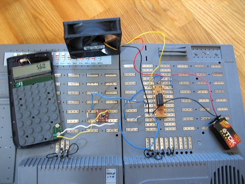 Im Normalfall wird die Schaltung über Solarzellen (6V) betrieben, aufgrund mangelnder Sonneneinstrahlung arbeitet auf dem Foto ein 9V-Block. Der Taschenrechner wird über die eingebaute Photozelle mit Strom versorgt. Der Lüfter liegt direkt an den 9 V, ebenso das IC. Der Reseteingang des 4024 wird über 680 kOhm an Minus gehalten, um ein unbeabsichtigtes Zurücksetzen zu vermeiden. Der Zähleingang wird über 5,6 kOhm an Plus gehalten, jeder ankommende Zählimpuls schaltet den Counter nach Minus und löst somit ein Weiterschalten des Zählerbausteins aus.