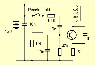 Noch bevor das Gerät seine Tauglichkeit am Fahrrad beweisen konnte, wurde es natürlich erst mal aufgeschraubt. Was da zum Vorschein kam, sah nicht nach sehr hohen Frequenzen aus: Ein kleiner Ferritstab, eine Schaltung mit einem Transistor, ein Reedkontakt für den Magneten an der Speiche und eine Fotobatterie mit 12 V. Hier die abgezeichnete Schaltung, die Kondensatoren sind nur geschätzt.