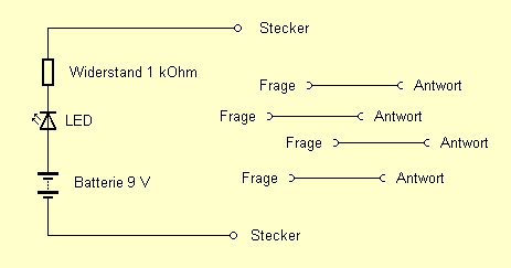 Batterie 9 V bauen. Zwei Kabel enden in zwei Steckern. Bei den Fragen