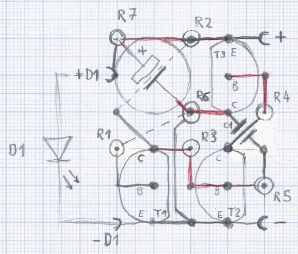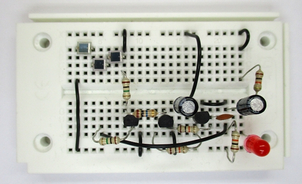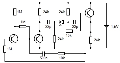 Die Schaltung wurde für den Lowpower-Betrieb optimiert. Deshalb hat der eigentliche Flip-Flop einen NPN- und einen PNP-Transistor bekommen. Man kann auf diese Weise die Verschwendung von Steuerstrom vermeiden. Beide Transistoren leiten nur für den kurzen Moment des LED-Blinkens. Damit stabile Bedingungen herrschen und die Schaltung sicher schwingt, gibt es eine zusätzliche Stufe mit einer Gleichspannungs-Gegenkopplung. Auch hier wurde durch besonders hochohmige Widerstände auf geringsten Verbrauch geachtet.