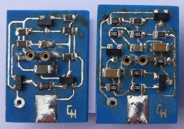 In der zweiten Version verwendet die Schaltung durchgehend SMD-Bauteile. Oberflächenmontierte Bauteile, aber ohne die Oberfläche. Das ist die Technik der Zukunft! So etwas wird man zukünftig wahrscheinlich direkt in Kleidungsstücke einweben.