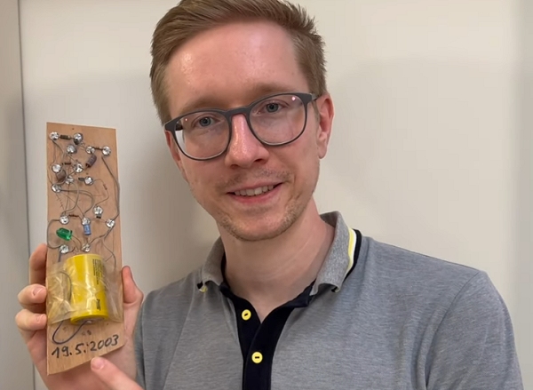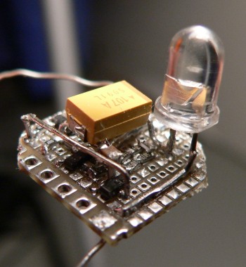 Martin Gerdes schreibt dazu: Der Charme liegt darin, dass ich statt Elkos MLCCs verwende, die es mittlerweile ja mit erheblicher Kapazität gibt, die man den Dingern nicht ansieht. Wer das Bauteil nicht kennt, fragt sich, wo wohl der nötige Kondensator verbaut ist. Für das Zeitglied habe ich zwei 1-µF-MLCCs genommen. Mit herkömmlichen Bauteilen ist der Blinker einfach ein Hingucker. An dem kleinen Henkel kann man sich so einen Blinker an den Hemdenknopf hängen, er beeindruckt die Leute immer noch. Meiner Frau gefallen die Dinger (erfreulicherweise; sonst hat sie mit Elektronik nichts am Hut), also hängen bei uns in der Wohnung etliche herum.