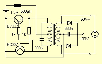 Ein unbekannter Übertrager mit einem Ferrit-Schalenkern aus der Bastelkiste passte zufällig gerade. Die Schaltung ist sehr einfach, weil nur eine Eingangsspannung von 1,2 V anliegt. Deshalb kann die Primärwicklung des Übertragers zugleich auch als Rückkopplungswicklung dienen. Man kommt mit zwei Widerständen aus.