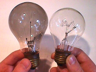 Die Lampe mit Wolfram-Glühfaden ist etwas kleiner und wesentlich heller als die Kohlefadenlampe. Wenn man den Fadenwiderstand im kalten Zustand misst, stellt man folgendes fest: Kohlefaden: 1280 Ohm, Wolframfaden: 92 Ohm. Beide Lampen waren ausgelegt für 220 Volt und 60 Watt. Der Nennstrom war also für beide 0,27 Ampere, der Arbeitswiderstand 810 Ohm. Also der Kohlefaden wird im heißen Zustand niederohmiger, der Metallfaden hochohmiger. Faustregel: Der Kaltwiderstand beträgt bei Wolframlampen 1/10 des Heißwiderstands.