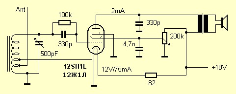 Die russische Röhre 12SH1L hat es mir angetan. Heizung nur 12V/75mA, dazu tauglich für kleine Anodenspannung. Es ist eine indirekt beheizte Pentode, geradezu ideal für ein Audion mit einstellbarer Rückkopplung. Die Röhre befindet sich normalerweise in einer Metallabschirmung, die allerdings aus Gründen der Optik entfernt wurde. Röhren müssen aus Glas sein!