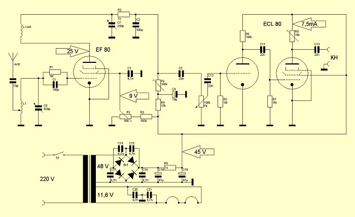 Warum denn in die Ferne schweifen, liegt das Gute doch so nah: Die EF80 liegt in jeder dritten Bastelkiste. Dazu passt als NF-Verstärker die ECL80, denn sie hat wie die EF80 einen Heizstrom von 300 mA. Beide Heizungen in Reihe brauchen 12V. Das ganze Radio läuft also mit 12 V, und es reicht sogar für einen kleinen Lautsprecher!
