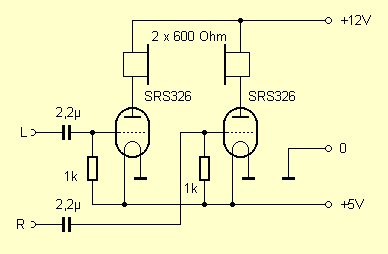 Die Heizspannung wird hier mit Vorwiderständen auf ca. 3,8 V gebracht.Der bescheidene Heizstrom von insgesamt 600 mA kann locker von einem PC-Netzteil nebenbei aufgebracht werden. Deshalb könnte das der ideale Kopfhörerverstärker für die PC-Soundkarte sein. Auch der direkte Einbau in den PC ist nicht unmöglich.