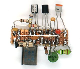 Michael Stutzbach berichtet: Habe das Gerät in der Trimmerversion jetzt nachgebaut (siehe Foto). Da der Stromverbrauch nur bei ca. 2,5 mA liegt, wurde die Stromversorgung in Form einer 3V-Knopfzelle gleich mit aufgelötet. Damit der Oszillator sicher schwingt musste ich den Rückkopplungskondensator auf 33pF vergrößern (nur bei 4 MHz, bei 6,144 MHz ging es auch mit 22pF).
