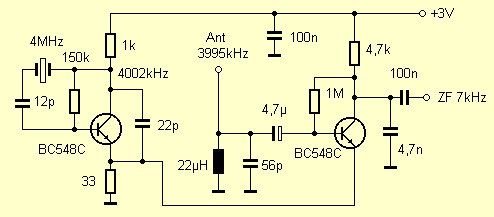 Die entscheidende Frage war, welcher leicht erhältliche Standardquarz passt zu einer DRM-Frequenz. Die Wahl fiel auf 4,000 MHz. In der Schaltung schwingt der Quarz ca. 2 kHz höher bei 4002 kHz. Das Empfangssignal wird damit von 3995 kHz auf 7 kHz herunter gemischt und erscheint mit invertiertem Spektrum am Eingang der PC-Soundkarte. Eigentlich sollte man eine ZF von 12 kHz anstreben. Aber das Open-Source-Projekt DREAM_V1.0 kommt genauso gut mit 7 kHz zurecht.