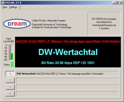 Also los, als Antenne reicht ein Draht von 3 Metern. Der Ausgang wird mit dem Mikrofoneingang der Soundkarte verbunden. Dann startet man DREAM und wartet einige Sekunden, bis die Software sich synchronisiert hat. Wenn alles glatt gegangen ist, kann man nun die Deutsche Welle in UKW-ähnlicher Qualität in Stereo hören.