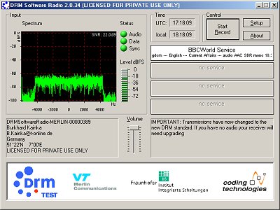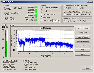 Zur Dekodierung wurde zunächst DREAM eingesetzt, weil eine genaue ZF-Lage von 12 kHz nur schwer justiert werden kann. Das Programm zeigt das bekannte DRM-Spektrum mit ausreichender Signalstärke und genügend Rauschabstand. Trotzdem wird das Tonsignal nur für kurze Momente hörbar.