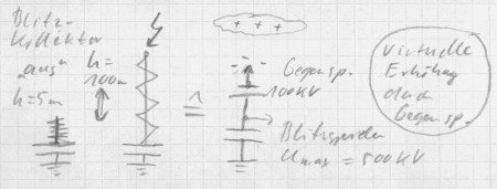| Das zweite Problem ist die außerordentlich geringe Häufigkeit, mit der Blitze an einem gegebenen Ort einschlagen. Das Projekt konnte nur gelingen, wenn eine Konzentration der Blitze erreicht würde. Im Prinzip schlagen Blitze häufiger in hohe Masten ein. Man könnte also einen mehrere Kilometer hohen Blitzableiter bauen, der dann tatsächlich besonders häufig getroffen würde. Drahtlos fand aber eine noch sehr viel elegantere Methode. Er entdeckte die bis dahin noch nie beschriebene Möglichkeit der virtuellen Erhöhung des Blitzfängers durch eine Gegenspannung. Die Idee ist genial einfach: Bei einer positiven Wolkenladung lädt man den Ableiter mit einer möglichst hohen Spannung negativ auf. Die Verzerrung des elektrischen Feldes entspricht dann einem entsprechend höheren Ableiter. Bei einer elektrischen Feldstärke von z.B. 1000 Volt pro Meter kann also mit einer Gegenspannung von 100 Kilovolt bereits ein einhundert Meter hoher Mast ersetzt werden. Dieser würde dann Blitze anziehen und - diese Möglichkeit beschäftige Drahtlos besonders - die Umgebung praktisch vor Blitztreffern abschirmen. |