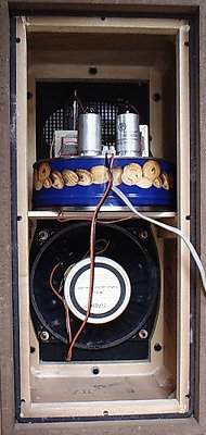 Der Hochtöner aus der Box musste weichen, um dem Verstärker Platz zu machen. Das erwies sich jedoch nicht als Nachteil, sondern eher als Vorteil. Das Gerät hat nun einen satten Klang und betont besonders die Bässe. Außerdem kann man nun durch die Stoffbespannung hindurch das Glühen der Röhren sehen. Und nicht nur die Kathoden, sondern auch eine große Glimmlampe, die als Aussteuerungsanzeige eingebaut wurde.