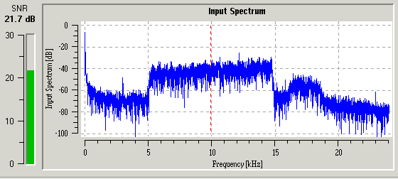 RTL DRM-2 auf 5990 kHz: Beim Betrieb ohne Vorselektion trifft zufällig ein sehr starker kommerzieller Digitalsender bei 6900 kHz auf die Spiegelfrequenz. Zieht man die Empfangsfrequenz um 2 kHz nach oben, erscheint das DRM-Spektrum bei 10 kHz, während das Spiegelsignal aus dem Nutzsignal herauswandert. Im Bild sieht man das etwas 2 kHz breite Signal der störenden Spiegelfrequenz. In dieser Einstellung erhält man of ein wesentlich besseres SNR und weniger Aussetzer.