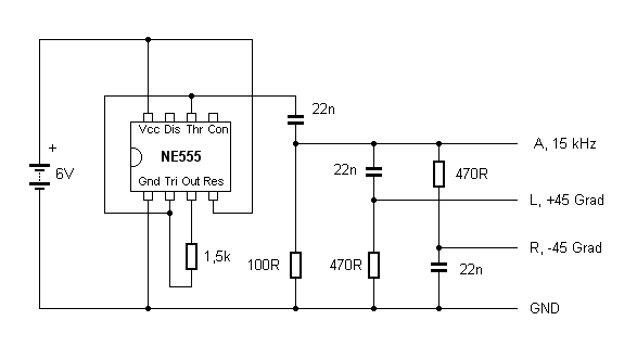 Für die Messung wird hier ein einfacher Tongenerator mit einem Timerbaustein 555 verwendet. Die Ausgangsfrequenz ist etwas von der Betriebsspannung abhängig und beträgt etwa 15 kHz bei einer Batteriespannung von 6 V. Zwei zusätzliche RC-Glieder sorgen für eine Phasenverschiebung von insgesamt 90 Grad zwischen dem L- und dem R-Ausgang. Damit sollen die I- und Q-Signale des IQ-Mischers simuliert werden.